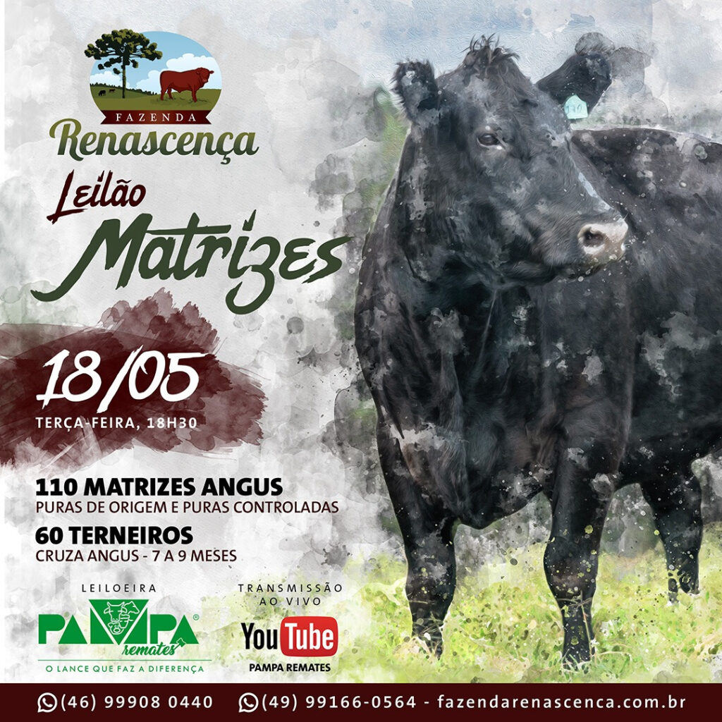 Matéria da ASSOCIAÇÃO BRASILEIRA DE ANGUS sobre o Leilão Matrizes da Fazenda RENASCENÇA: “Matrizes Angus Puras de Origem (PO) e Puras Controladas (PC) com produção comprovada serão ofertadas pela Fazenda Renascença, de Vargem (SC), em remate virtual no dia 18 de maio. Ao todo, serão colocadas em pista 110 matrizes que expressam as principais características